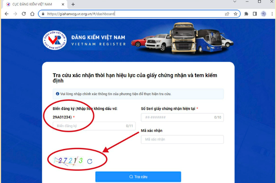 Để được gia hạn đăng kiểm, từ 3/6/2023 chủ phương tiện có thể truy cập trang web Cục Đăng kiểm Việt Nam http://www.vr.org.vn/, vào mục “Tra Cứu Gia Hạn Kiểm Định”, sẽ xuất hiện trang web: https://giahanxcg.vr.org.vn để tra cứu thông tin và in giấy xác nhận thời hạn hiệu lực của giấy chứng nhận, tem kiểm định theo các bước sau đây: