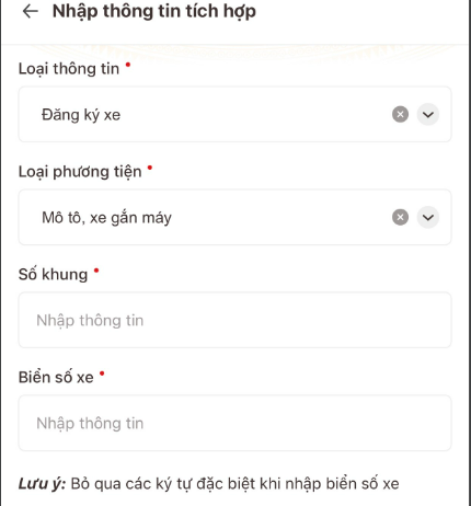 Lưu ý: Cần nhập liền mạch biển số xe, không cần thêm các ký tự đặc biệt. Ví dụ: biển số xe là 22-B2 361.77 thì nhập 22B236177 vào mục Biển số xe.