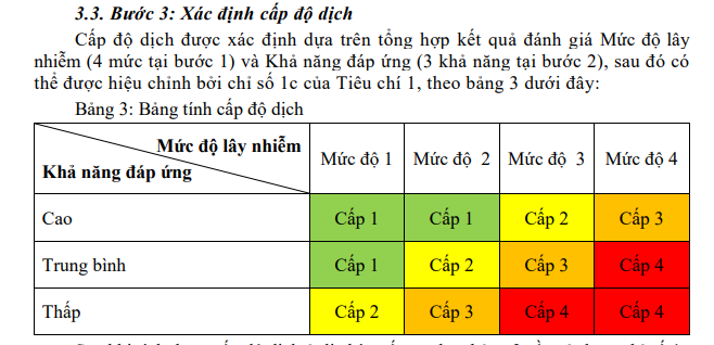Sau đó kết hợp với chỉ số 1 và 2 tiêu chí 2; nếu không đạt mức tối thiểu thì phải nâng mức độ lây nhiễm lên một mức độ (trừ trường hợp đang ở mức độ 4).