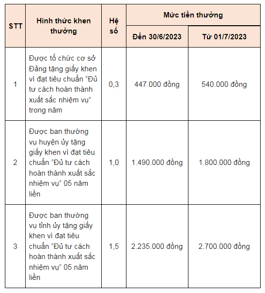 Khi mức lương cơ sở tăng, mức tiền thưởng cũng sẽ tăng. Hãy quan sát bảng này để thấy được biến động về mức tiền khen thưởng định kỳ của Đảng viên kể từ ngày 01/7/2023.