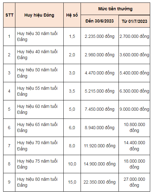 Đây là bảng thể hiện mức khen thưởng đối với Đảng viên theo huy hiệu Đảng trước và sau ngày 01/7/2023.