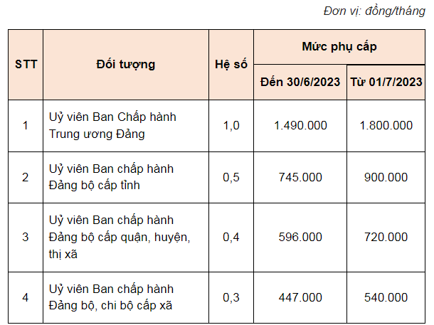 Mức phụ cấp này được tính theo hệ số và mức lương cơ sở. Trong đó, Uỷ viên Ban Chấp hành Trung ương Đảng, mức phụ cấp là 01 tháng lương cơ sở, Uỷ viên Ban chấp hành Đảng bộ cấp tỉnh mức phụ cấp là 0,5 tháng lương cơ sở, Uỷ viên Ban chấp hành Đảng bộ cấp quận, huyện, thị xã mức phụ cấp là 0,4 tháng lương cơ sở và Uỷ viên Ban chấp hành Đảng bộ, chi bộ cấp xã và mức phụ cấp là 0,3 tháng lương cơ sở.