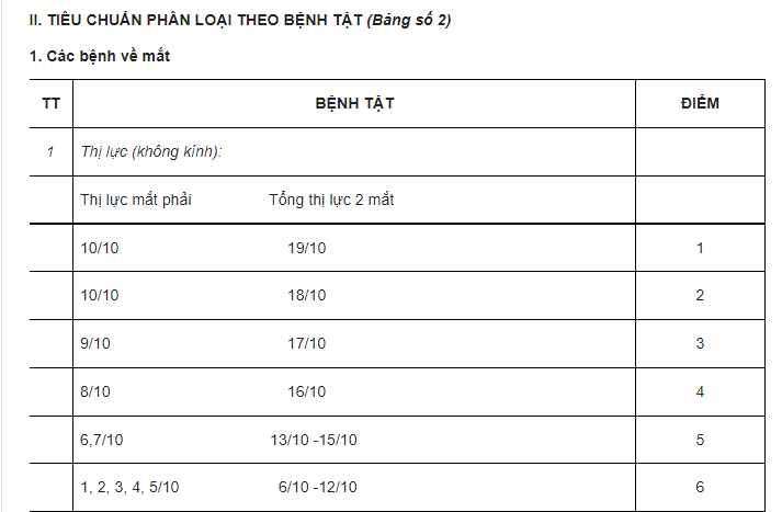 Chào bạn, căn cứ theo tiêu chuẩn bệnh tật các bệnh về mắt tại Thông tư liên tịch số 16/2016/TTLT-BYT-BQP, có thể thấy việc phân loại, chấm điểm đối với thị lực không kính như sau: