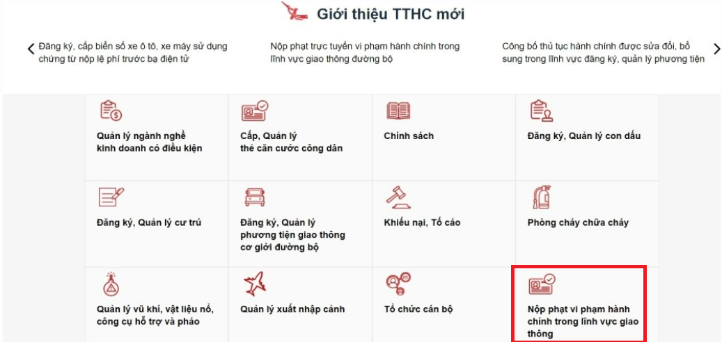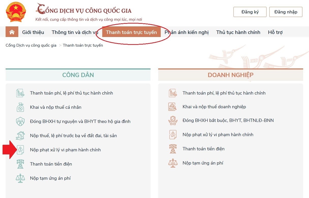 Ở menu ở góc trên cùng bên phải của giao diện trang chủ, Chọn mục “Thanh toán trực tuyến”, rồi chọn “Nộp phạt xử lý vi phạm hành chính”, tiếp đó bấm chọn “Tra cứu, thanh toán vi phạm giao thông”.