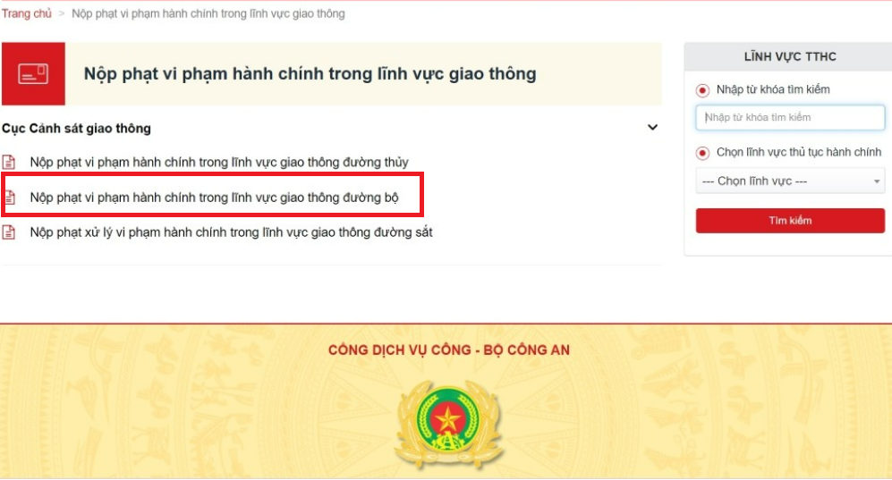Kế đó, chọn mục “Nộp phạt xử lý hành chính trong lĩnh vực giao thông đường bộ”.