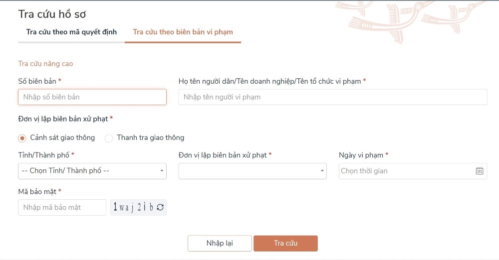 - Nếu tra cứu theo mã quyết định thì chọn mục “Cảnh sát giao thông”, điền thông tin về “Số quyết định” và nhập “Mã bảo mật”.
