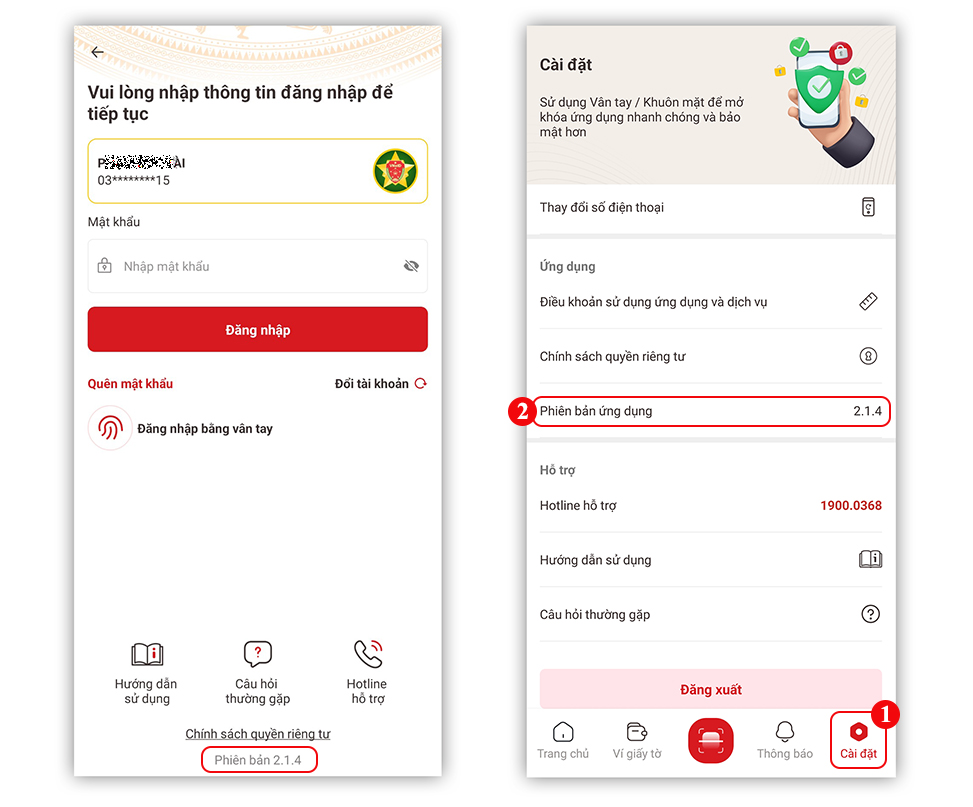 (1) Kiểm tra phiên bản hiện tại của ứng dụng (tối thiểu là phiên bản 2.0.7) bằng cách kiểm tra trên màn hình đăng nhập VNeID hoặc bạn cũng có thể đăng nhập vào VNeID như bình thường và chọn mục Cài đặt (1) và xem Phiên bản ứng dụng (2) đang sử dụng.