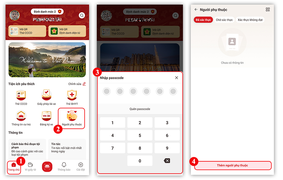 Bước 2: Trên trang chủ (1) chọn tiện ích yêu thích là Người phụ thuộc (2). Bạn nhập mã Passcode (3) của cá nhân và thêm người phụ thuộc (4).