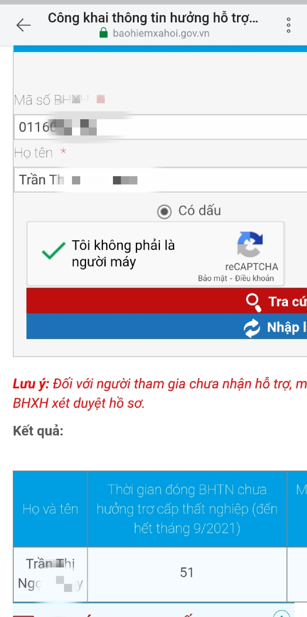 Sau đó, bấm vào ô "Tôi không phải là người máy" và tiến hành "Tra cứu". Cũng giống với tra cứu ở cách 1, thông tin tra cứu sẽ là số tháng đóng BHXH và mức tiền hưởng.