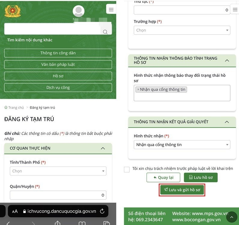 Ở mục Hình thức nhận, chọn hình thức nhận kết quả giải quyết trực tiếp tại Cơ quan, qua Email hoặc qua cổng thông tin. Nhấn Lưu và gửi hồ sơ để hoàn tất.