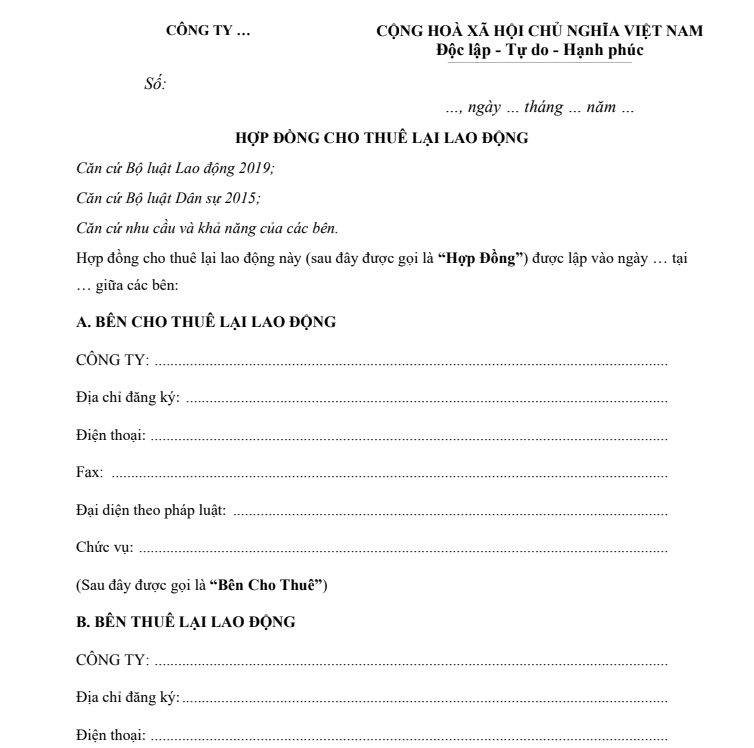 Dưới đây là mẫu hợp đồng cho thuê lại lao động theo quy định hiện nay: