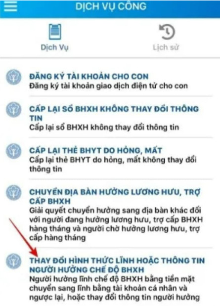 Bước 2. Chọn mục "Thay đổi hình thức lĩnh hoặc thông tin người hưởng chế độ BHXH".