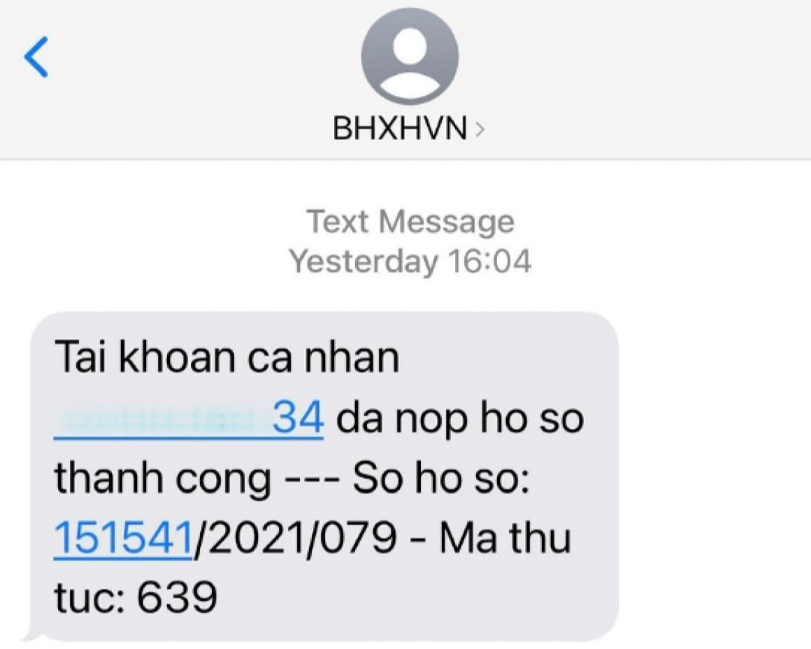 Bước 6: BHXH Việt Nam sẽ gửi tin nhắn đến điện thoại người dùng, thông báo tài khoản cá nhân đã nộp hồ sơ thành công.