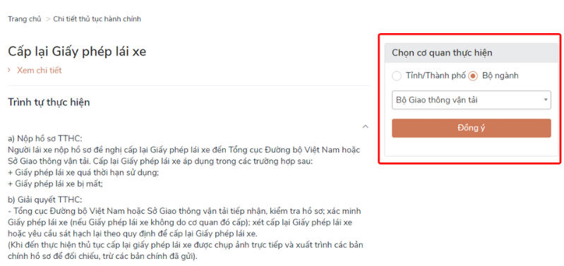 - Tỉnh/Thành phố: Chọn tỉnh hoặc thành phố nơi cấp bằng lái xe. Sau đó chọn cơ quan cấp quận/huyện hoặc Sở Giao thông vận tải của tỉnh/thành phố.