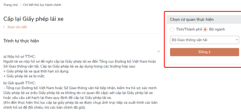 Bước 3: Chọn Cơ quan thực hiện cấp lại bằng lái xe A1: