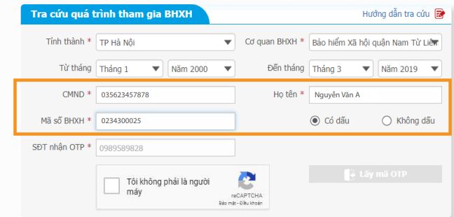 - Phần thông tin cá nhân, điền đầy đủ Số CMND, họ tên của người cần tra cứu, tên có thể viết có dấu hay không có dấu và kích vào tùy chọn ngay bên dưới. Nhập chính xác mã số BHXH trong ô tương ứng.