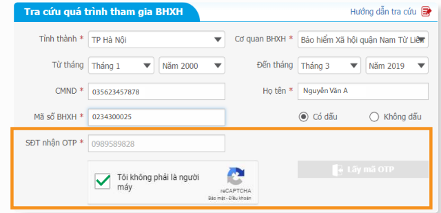 - Nhập chính xác số điện thoại mà bạn có thể nhận tin nhắn để nhận mã số OTP của dịch vụ Chăm sóc khách hàng BHXH. Tích chọn ô “Tôi không phải người máy” để xác minh thông tin, sau đó kích chuột vào ô “Lấy mã OTP”. Mã xác thực sẽ được gửi đến số điện thoại bạn đăng ký.