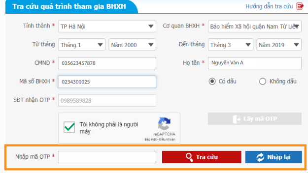 - Điền mã số xác nhận OTP trong tin nhắn nhận được vào ô “ Nhập mã OTP” (trong thời gian 4 phút từ khi nhận được tin nhắn), kích chọn nút “Tra cứu” để bắt đầu quá trình tra cứu. Khi các thông tin được điền là hợp lệ, bạn sẽ nhận được bảng kết quả tra cứu ngay phía dưới. Quá thời gian nhập mã, hệ thống sẽ yêu cầu lấy lại mã.