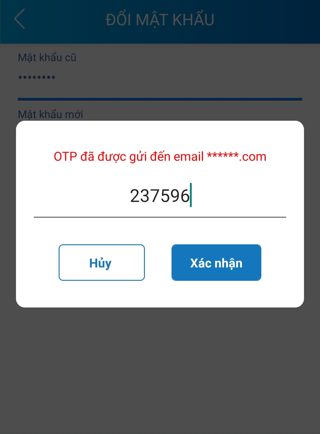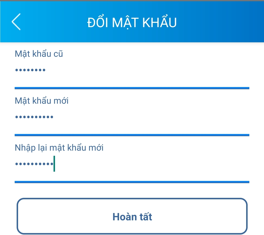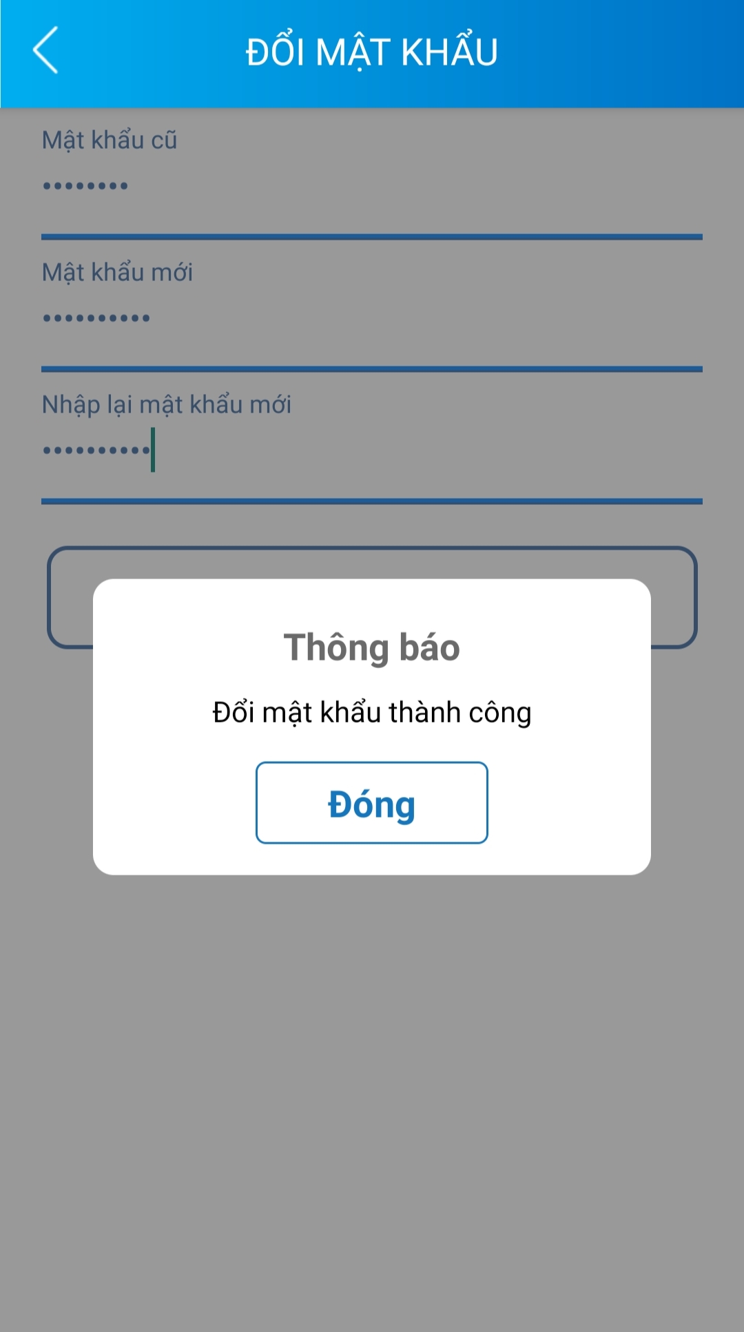 Nhập lần lượt mật khẩu đang sử dụng và 02 lần mật khẩu mới như bên dưới: