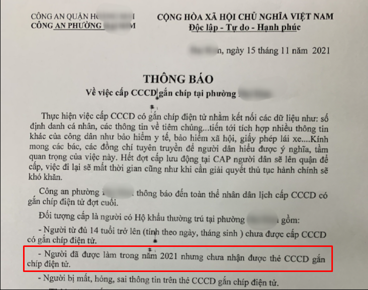 Hiện nay, nhiều địa phương như Hà Nội thông báo những người đã làm Căn cước công dân gắn chip năm 2021 nhưng chưa nhận được thẻ cần đi làm lại thẻ. Chẳng hạn thông báo sau: