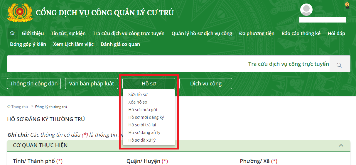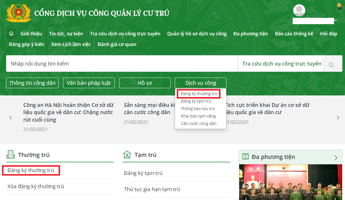 Bước tiếp theo, chọn mục “Đăng ký thường trú” tại trang chủ.