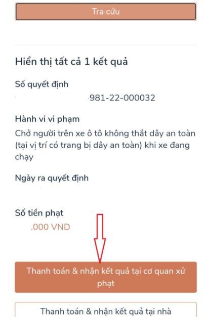 Bước 4: Bên dưới kết quả quyết định xử phạt vi phạm giao thông, chọn Thanh toán và nhận kết quả tại cơ quan xử phạt > Nhập thông tin người nộp tiền > Chọn Thanh toán.
