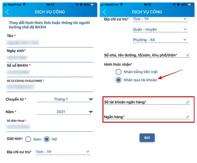 Kế đến, nhập thông tin bắt buộc (dấu sao đỏ), tại mục Hình thức nhận chọn “Nhận qua tài khoản” và nhập số tài khoản ngân hàng của người hưởng lương hưu, tên ngân hàng, ghi rõ tên chi nhánh ngân hàng rồi bấm Gửi.