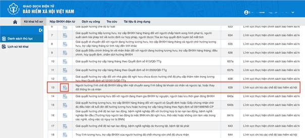 Bước 3 - Tìm, sau đó chọn dịch vụ công “Người hưởng lĩnh chế độ BHXH bằng tiền mặt chuyển sang lĩnh bằng tài khoản cá nhân và ngược lại, hoặc thay đổi thông tin cá nhân”, sau đó bấm vào hình ảnh tờ khai bên cạnh để kê khai thông tin.