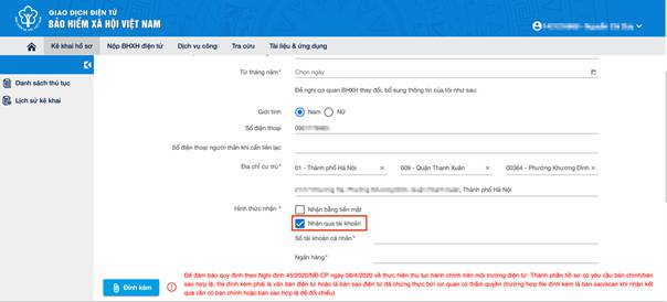 Bước 4 - Kê khai vào các thông tin và lựa chọn "nhận qua tài khoản", điền thông tin về số tài khoản nhận chế độ, mã xác nhận rồi chọn “xác nhận”.