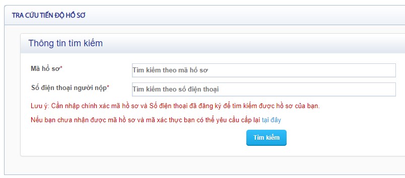 - Nhập mã hồ sơ và số điện thoại người nộp, nhấn vào nút ”Tìm kiếm”.