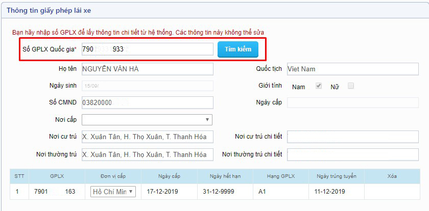 Nếu tìm thấy, thông tin sẽ hiện lên và hệ thống sẽ tự điền các thông tin vào các mục như: Họ tên, số CMND, nơi cư trú…