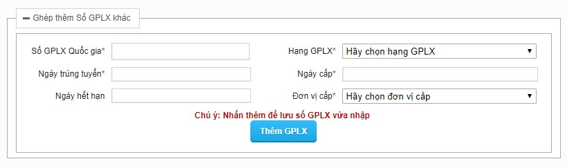 Phần dưới là mục tùy chọn Ghép thêm Số GPLX khác nếu có nhu cầu muốn ghép thêm, nếu không có thể bỏ qua mục này.
