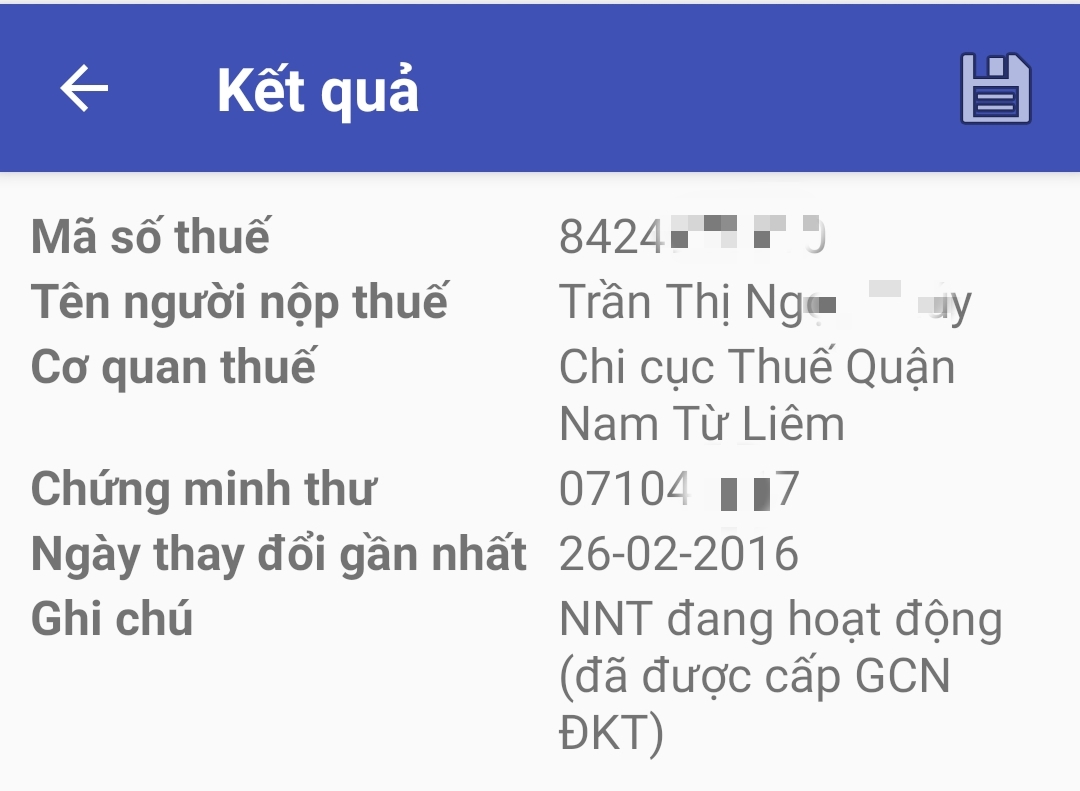 Ứng dụng sẽ trả về kết quả thông tin gồm: mã số thuế, tên người nộp thuế, cơ quan thuế, chứng minh thư... như bên dưới.