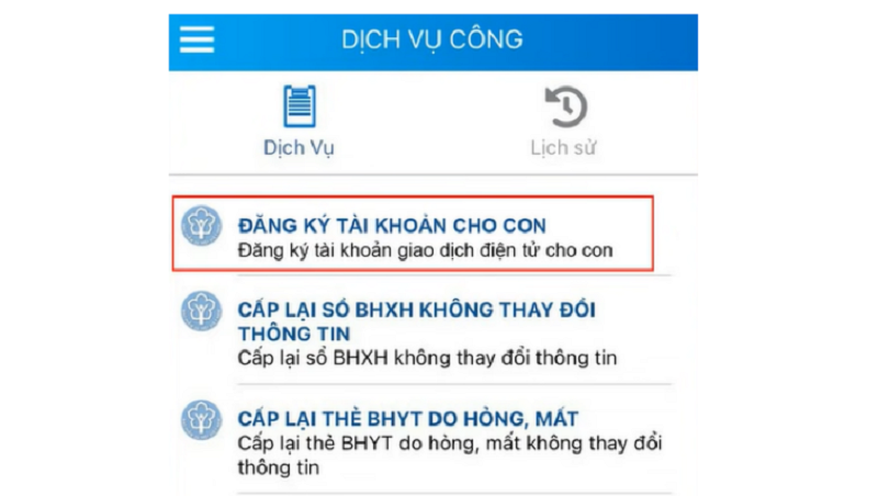 Bước 3: Khi đã bấm vào dịch vụ công, chọn mục Đăng ký tài khoản cho con.