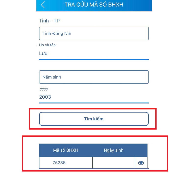 Bước 3: Nhấn vào mục Tìm kiếm để xem mã BHXH.