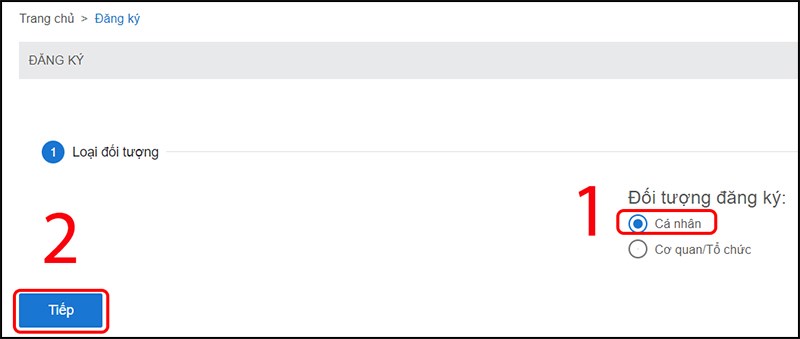 Bước 2: Sau khi nhấn chọn Đăng ký, màn hình sẽ hiện ra như hình bên dưới. Ở phần Đối tượng đăng ký nhấn chọn ô Cá nhân sau đó chọn Tiếp.