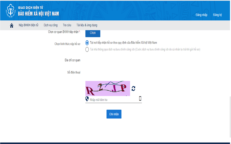 Click chọn hình thức nộp hồ sơ, nhập mã kiểm tra sau đó chọn Ghi nhận