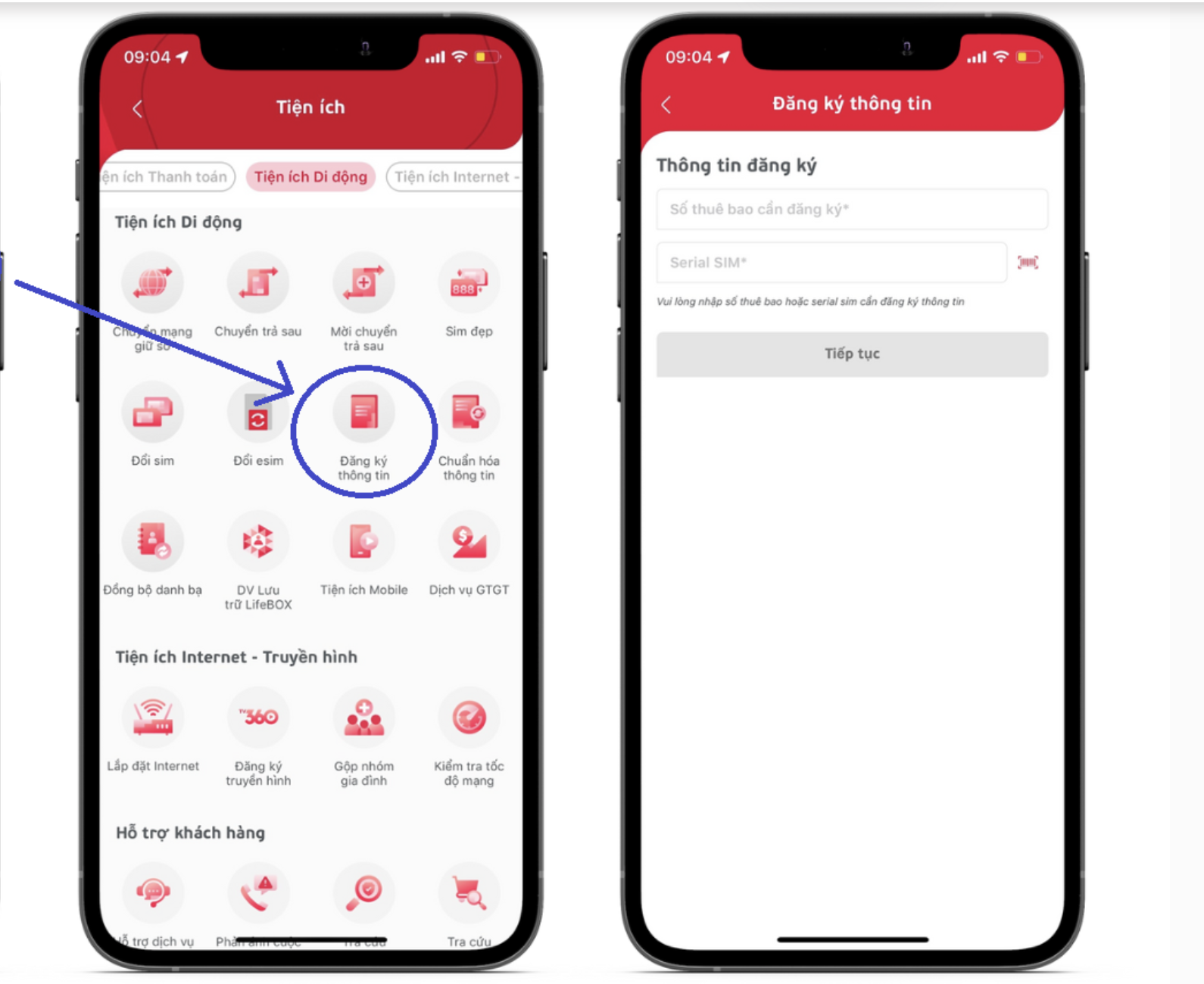 - Nhập số thuê bao cần đăng ký và Serial sim vào các ô tương ứng, sau đó nhấn "Tiếp tục".