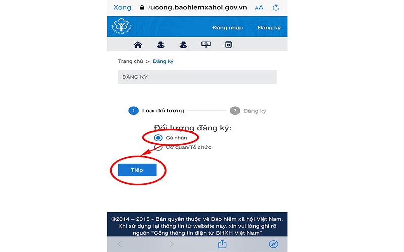 Bước 2: Nhấp vào Cá nhân tại mục Loại đối tượng đăng ký, chọn Tiếp
