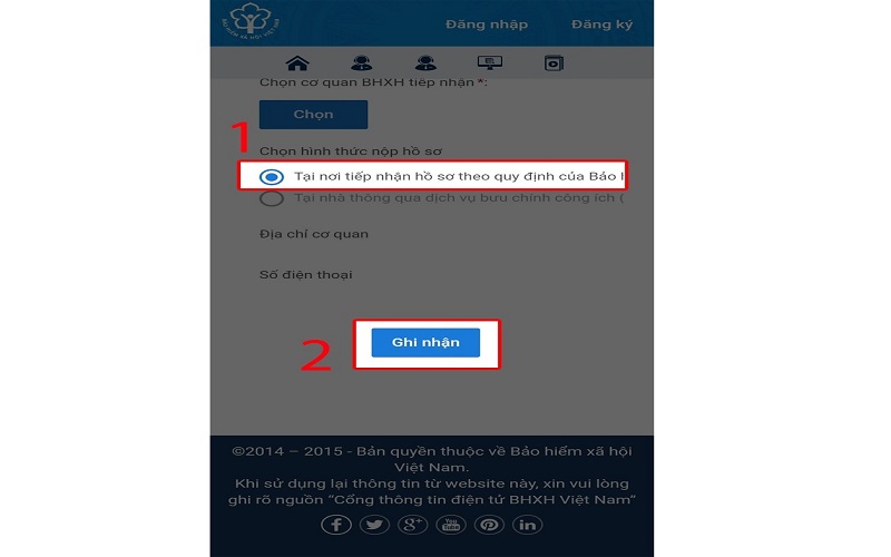 Bước 5: Ấn chọn Tại nơi tiếp nhận hồ sơ theo quy định của Bảo hiểm Xã hội giống hình bên dưới, chọn tiếp Ghi nhận.