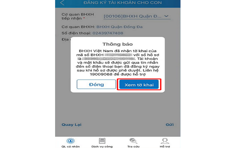 Sau khi ấn gửi tờ khai để hoàn tất việc đăng ký ở bước cuối, ứng dụng sẽ hiển thị lại thông tin tờ khai của người đăng ký trên màn hình. Nhiều cơ quan bảo hiểm xã hội sẽ yêu cầu người đăng ký in tờ khai này để nộp bổ sung hồ sơ.