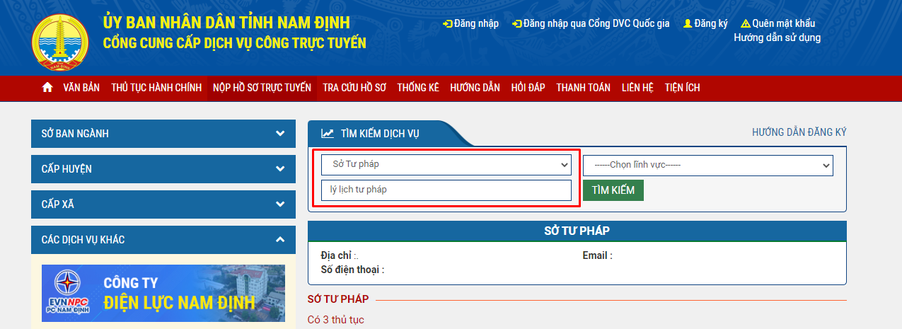 Đăng ký yêu cầu cấp phiếu lý lịch tư pháp tại Sở Tư pháp tỉnh Nam Định