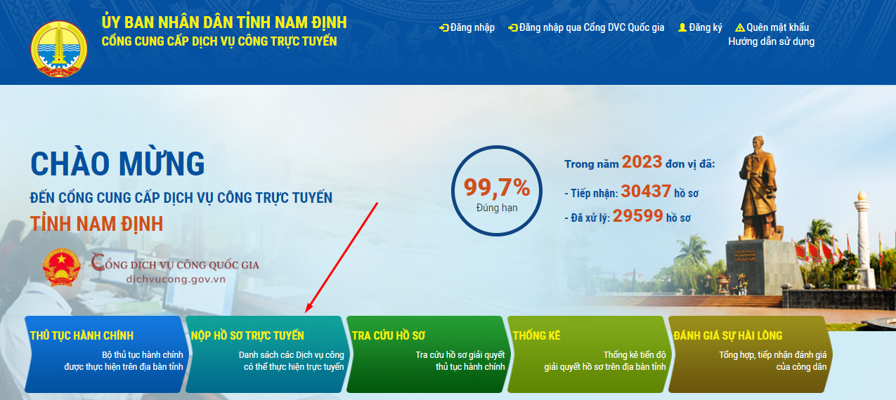 Bước 1: Nhấn vào đường dẫn “https://dichvucong.namdinh.gov.vn/portaldvc/Home/default.aspx” và nhấp chuột vào “Nộp hồ sơ trực tuyến”