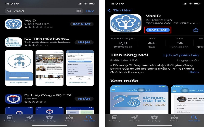 Nếu đang sử dụng mà VssID báo phiên bản sử dụng thấp hơn phiên bản hiện tại, người dùng có thể vào Google Play nếu sử dụng Android hoặc vào App Store nếu sử dụng iOS, tìm VssID trong kho ứng dụng và chọn cập nhật.