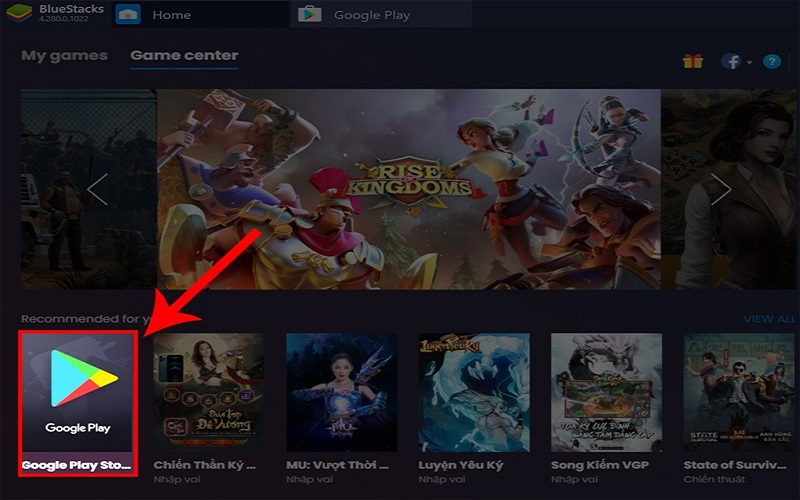 Bước 1: khởi chạy Giả lập BlueStacks, chọn biểu tượng cửa hàng ứng Google Play.