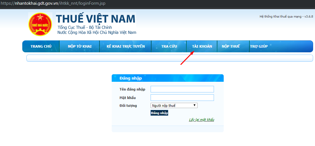 Bước 1: Đăng nhập vào website https://nhantokhai.gdt.gov.vn và kích vào mục Tài khoản, sau đó Đăng nhập. Nếu chưa đăng ký thì nhấn “Đăng ký thêm tờ khai”;
