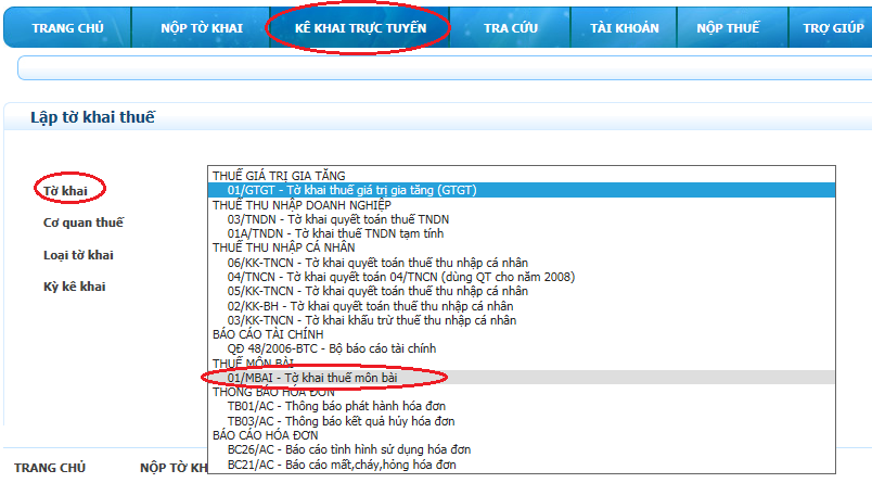 Bước 3: Chọn mục “Kê khai trực tuyến”. Ở mục Tờ khai tích chọn “01/MBAI – Tờ khai lệ phí môn bài (ND139)” và ấn Tiếp tục;