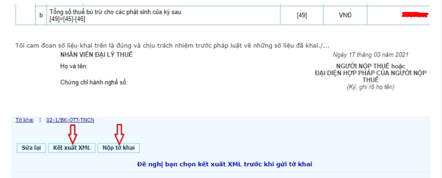 - Bước 6: In tờ khai đã nộp. Tại bước 4, sau khi chọn “kết xuất XML”, hệ thống sẽ gửi về file tờ khai theo định dạng XML; người nộp tờ khai tải ứng dụng iTax Viewer để mở file nêu trên. Sau đó chọn in 02 bản, ký tên người nộp thuế đầy đủ.