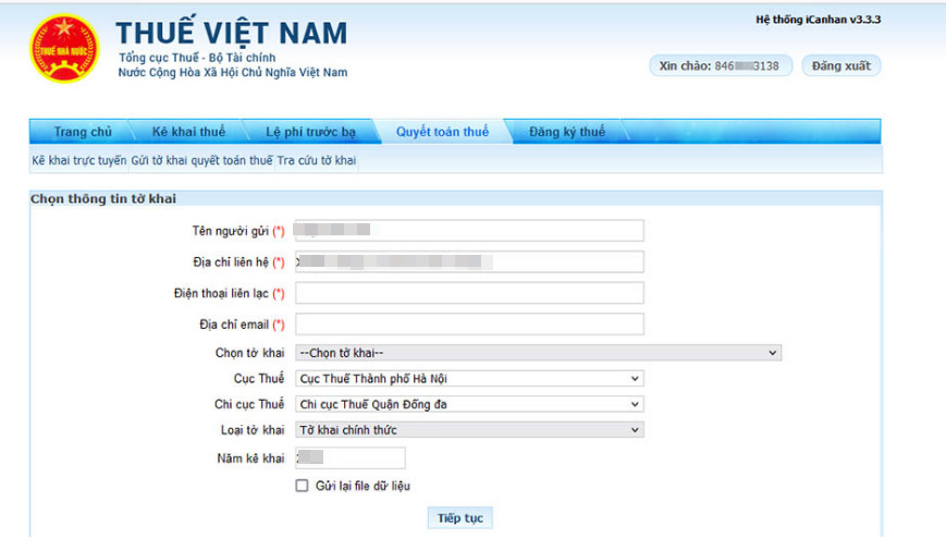 Lưu ý những trường thông tin có dấu (*) màu đỏ không được bỏ trống, bắt buộc phải điền đầy đủ thông tin. Một số trường sẽ được hệ thống điền tự động, người khai thuế tiến hành bổ sung những thông tin còn thiếu.