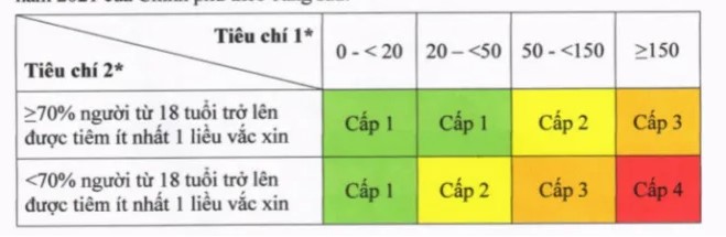 Theo Nghị quyết 128, Chính phủ thống nhất phân loại cấp độ dịch theo 04 mức gồm: - Cấp 1: Nguy cơ thấp - vùng màu xanh. - Cấp 2: Nguy cơ trung bình - vùng màu vàng. - Cấp 3: Nguy cơ cao - vùng màu cam. - Cấp 4: Nguy cơ rất cao - vùng màu đỏ.Các tiêu chí phân loại gồm: - Tỷ lệ ca mắc mới tại cộng đồng/số dân/thời gian (số ca mắc mới tại cộng đồng/100.000 người/tuần); - Độ bao phủ vắc xin (Tỷ lệ người từ 18 tuổi trở lên được tiêm ít nhất 01 liều vắc xin phòng Covid-19); - Đảm bảo khả năng thu dung, điều trị của cơ sở khám bệnh, chữa bệnh các tuyến.